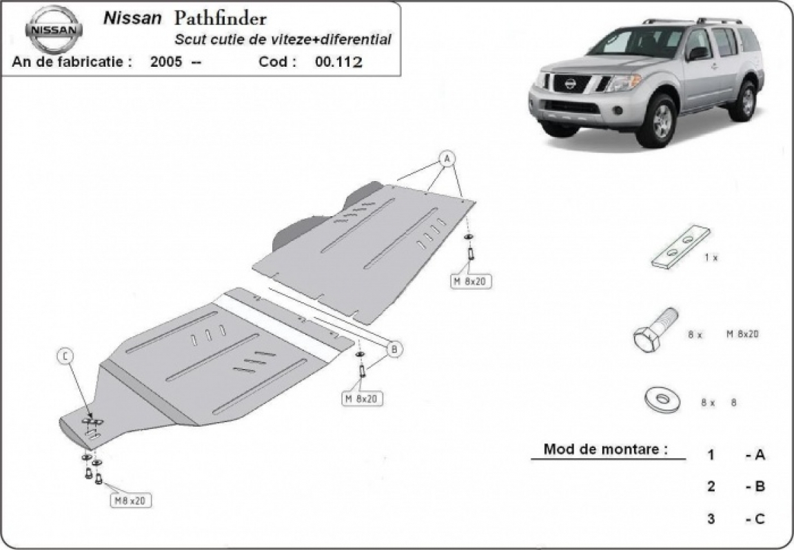 Skid plate for the protection of the: gearbox, Transfer case The skid plate is new and fits perfectly for all versions of Nissan Pathfinder manufactured between 2005 and 2015. Made out of 3 mm thick Steel plate. Screws, nuts, clips, all fastening accessories are included. All skid plates are powder coated to prevent corrosion. The exterior of the skid plate is provided with Steel reinforcements, which increases the resistance to impact. |