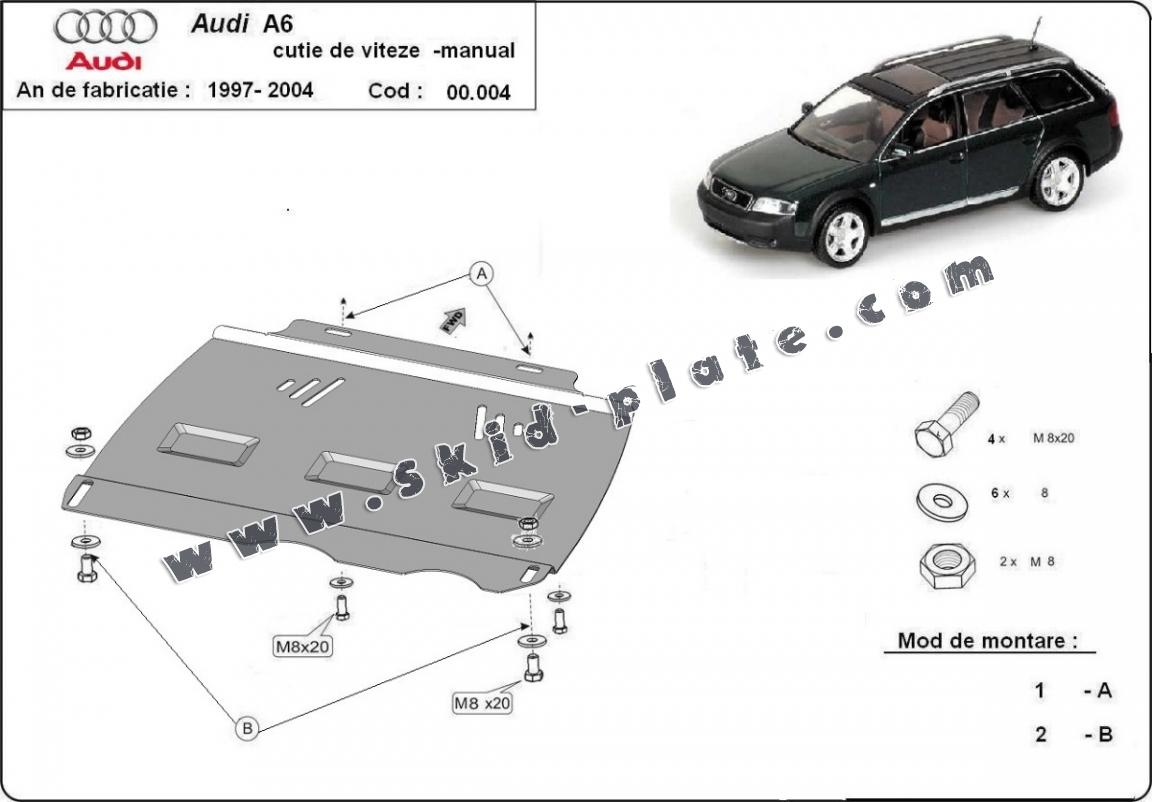 The skid plate is new and fits perfectly for the Audi A6 - manuelle, with the following engine/drive versions: manuala - manufactured between 1997 and 2004.