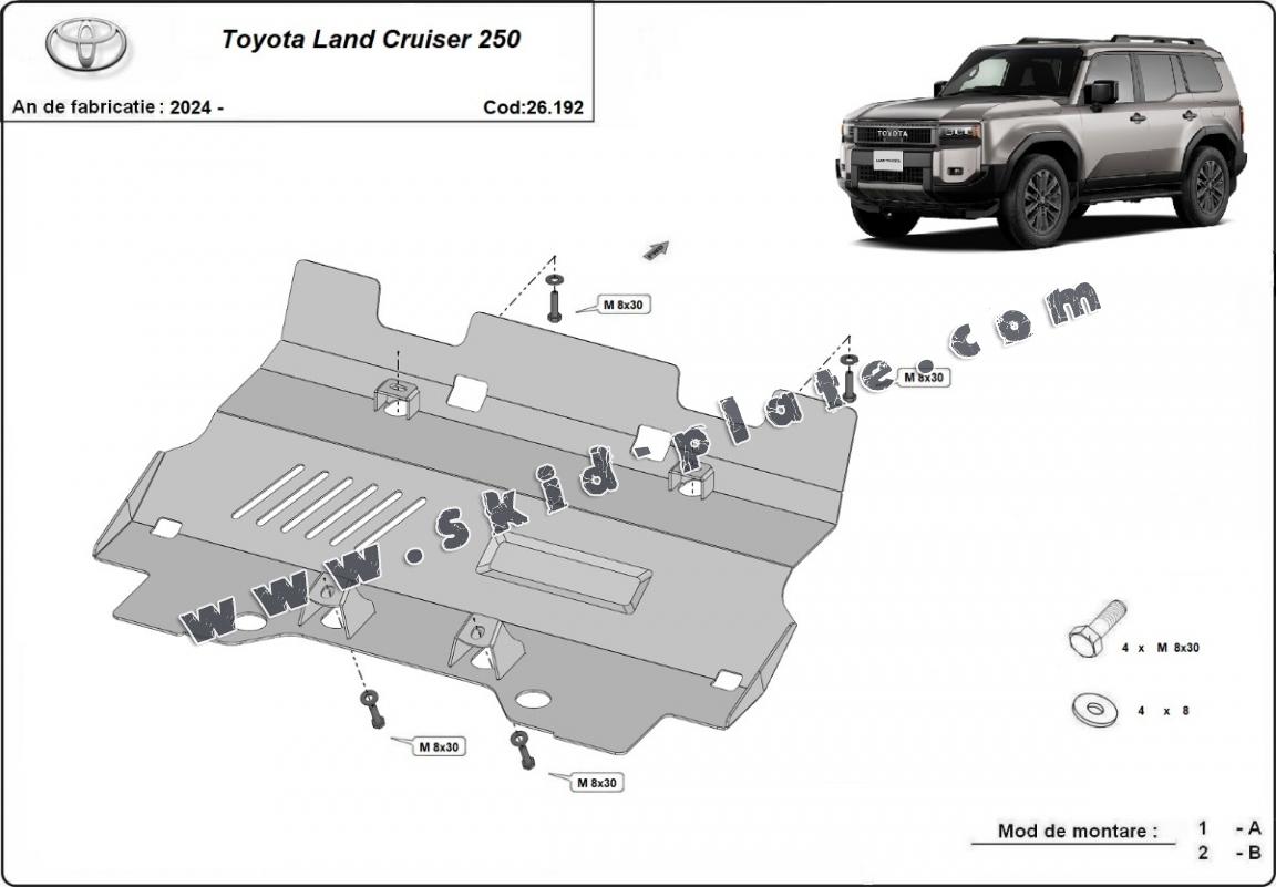 Skid plate for the protection of the: radiator The skid plate is new and fits perfectly for all versions of Toyota Land Cruiser 250 manufactured between 2024 and 2026. Made out of 3 mm thick Steel plate. Screws, nuts, clips, all fastening accessories are included. All skid plates are powder coated to prevent corrosion. The exterior of the skid plate is provided with Steel reinforcements, which increases the resistance to impact. |