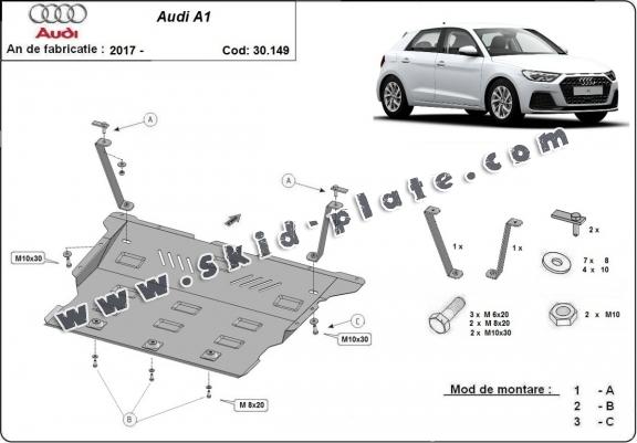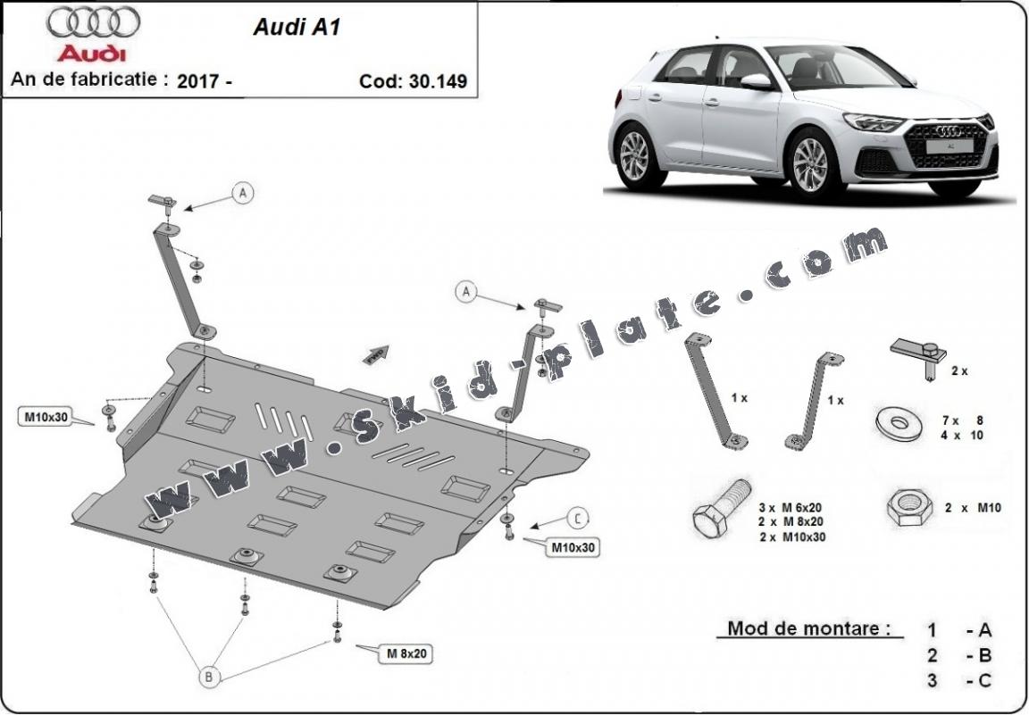 Skid plate for the protection of the: engine, gearbox, radiator The skid plate is new and fits perfectly for all versions of Audi A1 manufactured between 2017 and 2026. Made out of 2 mm thick Steel plate. Screws, nuts, clips, all fastening accessories are included. All skid plates are powder coated to prevent corrosion. The exterior of the skid plate is provided with Steel reinforcements, which increases the resistance to impact. |