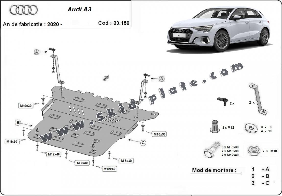 Skid plate for the protection of the: engine, gearbox, radiator The skid plate is new and fits perfectly for all versions of Audi A3 manufactured between 2020 and 2026. Made out of 2 mm thick Steel plate. Screws, nuts, clips, all fastening accessories are included. All skid plates are powder coated to prevent corrosion. The exterior of the skid plate is provided with Steel reinforcements, which increases the resistance to impact. |