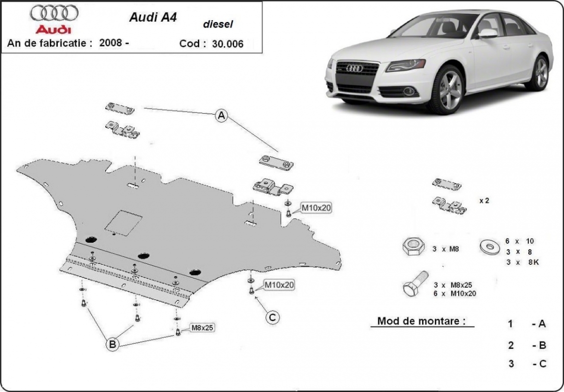 The skid plate is new and fits perfectly for the Audi A4 B8 All Road, with the following engine/drive versions: 2.0TFSI,2.0Tdi, quatro, 2.7TDI - manufactured between 2008 and 2014.