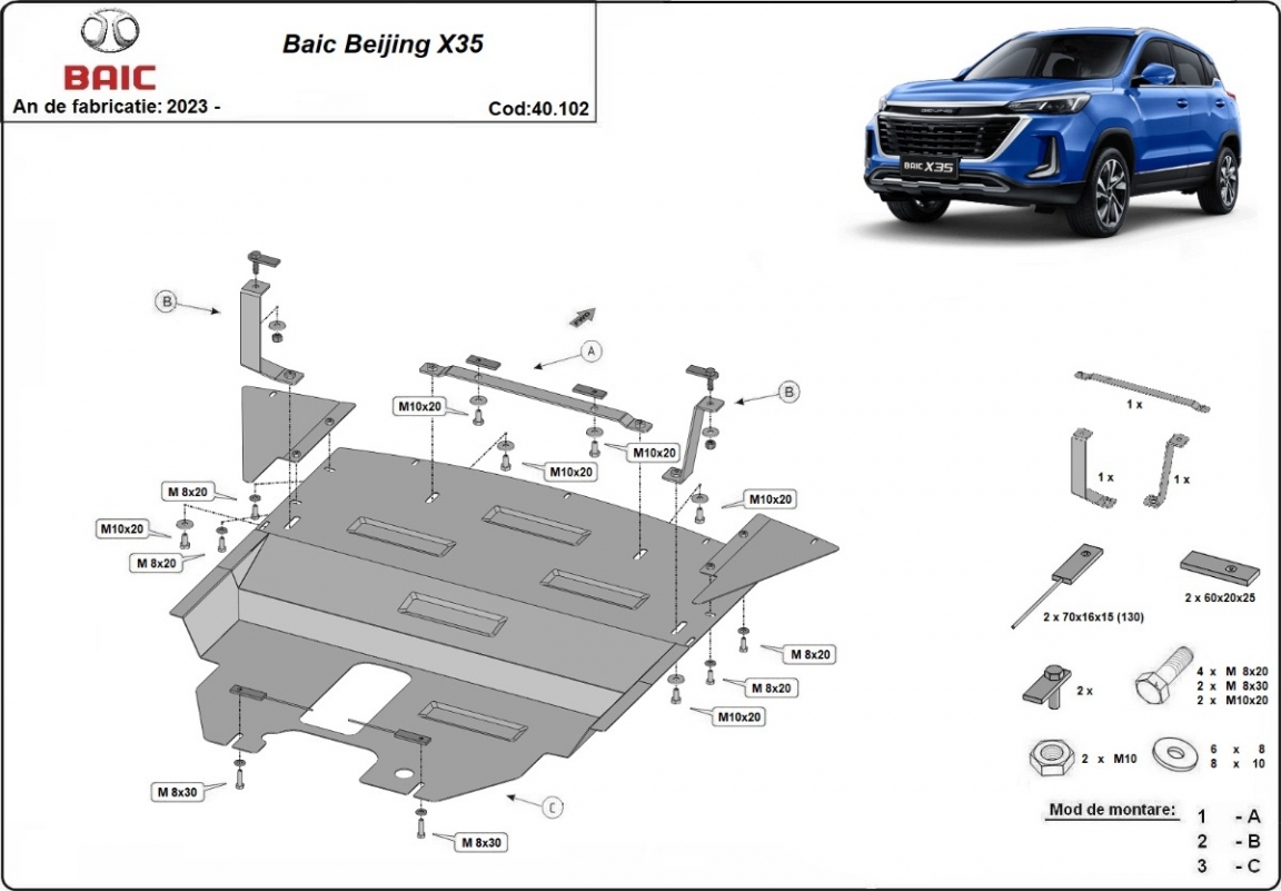 The skid plate is new and fits perfectly for all versions of Baic Beijing X35 manufactured between 2023 and 2026.