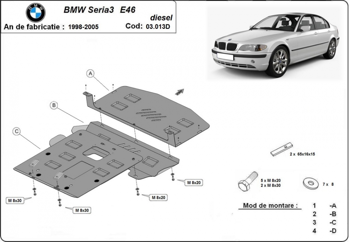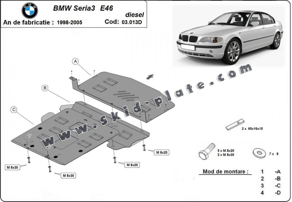 The skid plate is new and fits perfectly for all versions of BMW Seria 3 E46 manufactured between 1998 and 2005.
