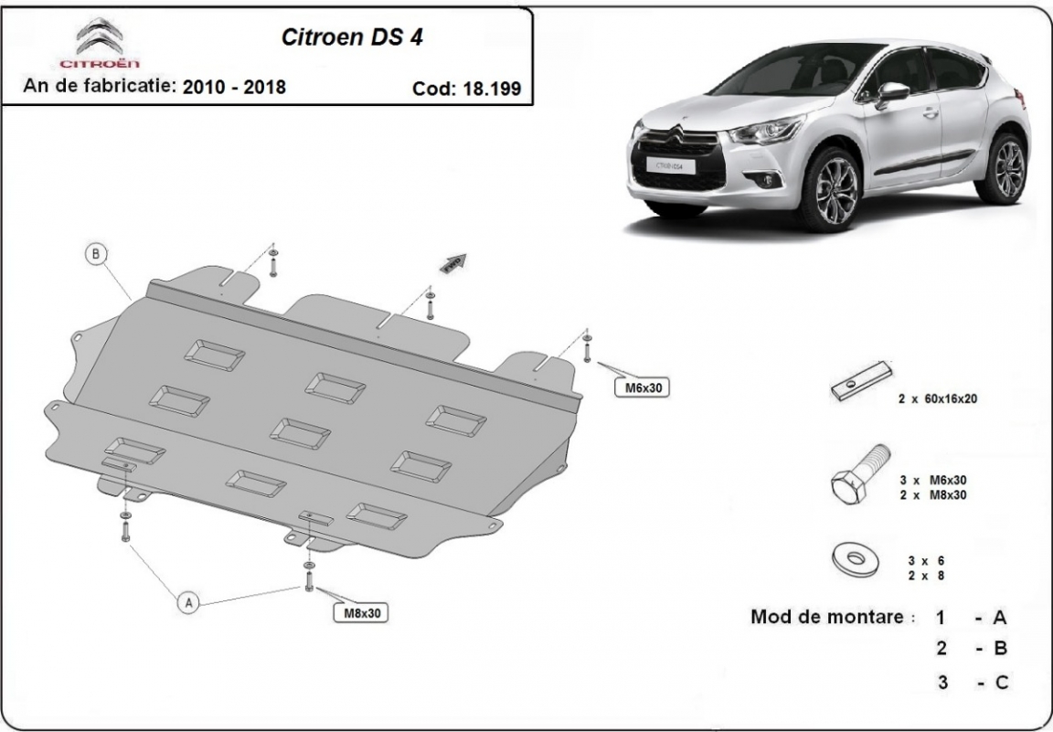 Skid plate for the protection of the: engine, gearbox, radiator The skid plate is new and fits perfectly for all versions of Citroen DS4 manufactured between 2010 and 2018. Made out of 2 mm thick Steel plate. Screws, nuts, clips, all fastening accessories are included. All skid plates are powder coated to prevent corrosion. The exterior of the skid plate is provided with Steel reinforcements, which increases the resistance to impact. |