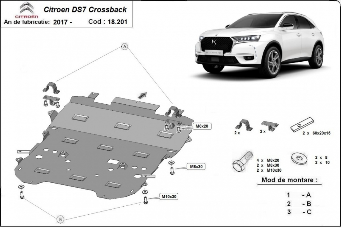 Skid plate for the protection of the: engine, gearbox, radiator, front bumper The skid plate is new and fits perfectly for all versions of Citroen DS7 Crossback manufactured between 2017 and 2026. Made out of 2 mm thick Steel plate. Screws, nuts, clips, all fastening accessories are included. All skid plates are powder coated to prevent corrosion. The exterior of the skid plate is provided with Steel reinforcements, which increases the resistance to impact. |