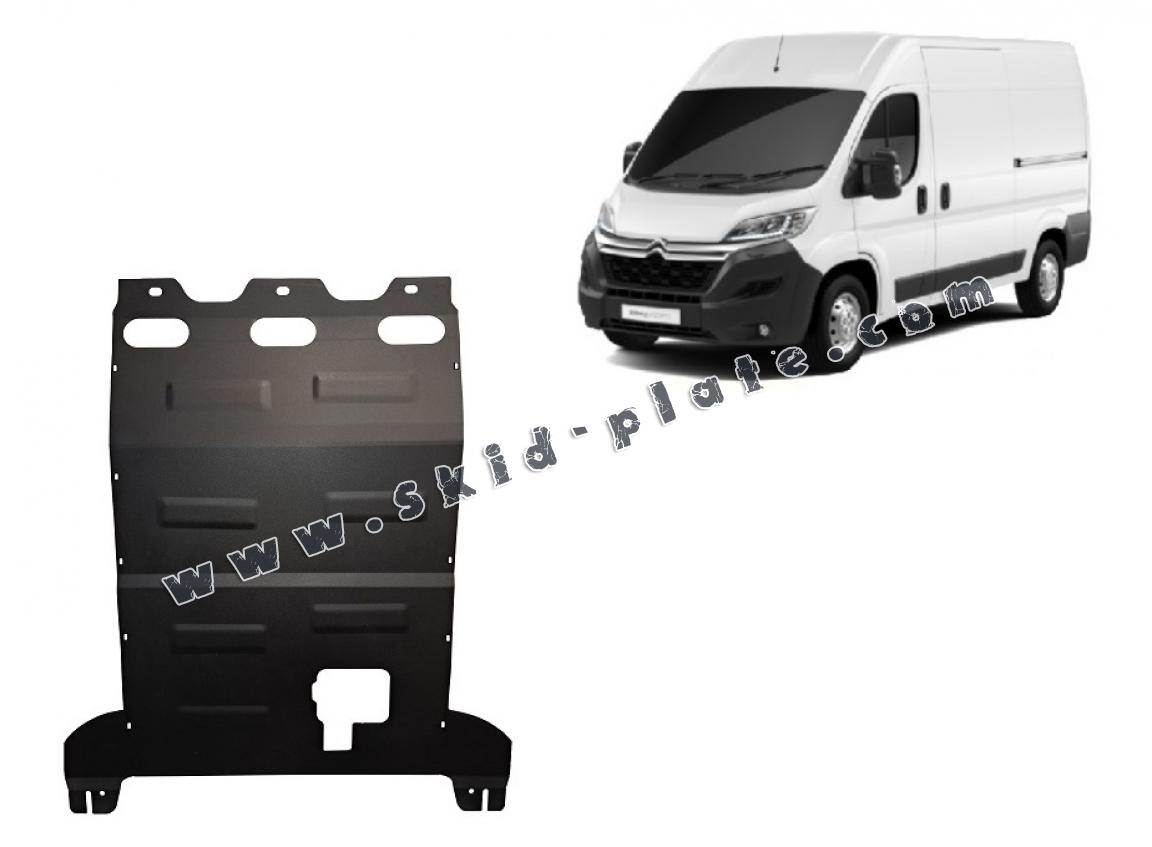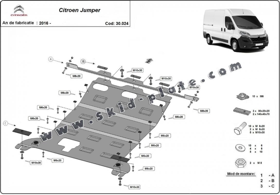 Skid plate for the protection of the: engine, gearbox, radiator The skid plate is new and fits perfectly for all versions of Citroen Jumper manufactured between 2016 and 2026. Made out of 2.5 mm thick Steel plate. Screws, nuts, clips, all fastening accessories are included. All skid plates are powder coated to prevent corrosion. The exterior of the skid plate is provided with Steel reinforcements, which increases the resistance to impact. |