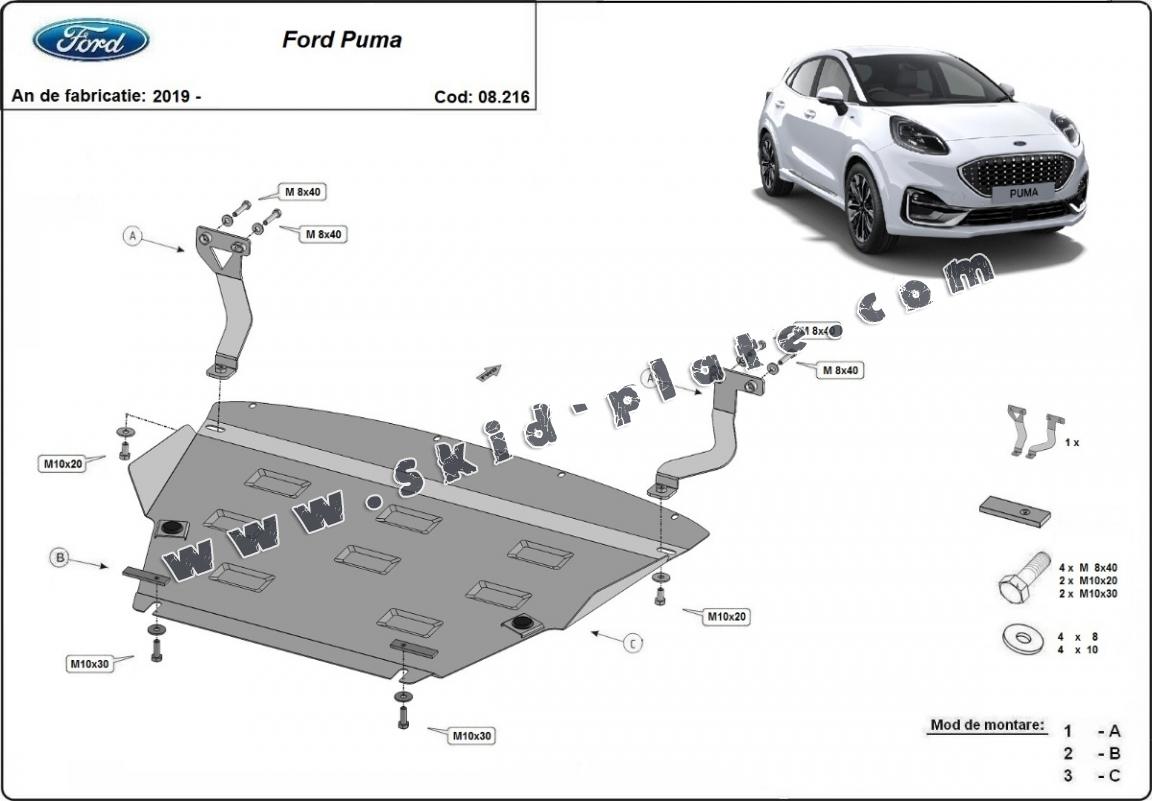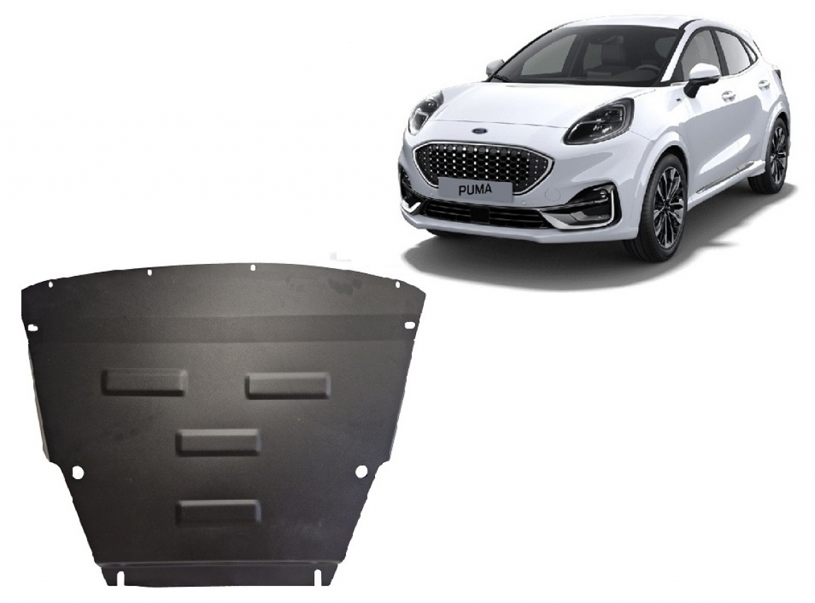 Skid plate for the protection of the: engine, gearbox, radiator The skid plate is new and fits perfectly for all versions of Ford Puma manufactured between 2019 and 2026. Made out of 2 mm thick Steel plate. Screws, nuts, clips, all fastening accessories are included. All skid plates are powder coated to prevent corrosion. The exterior of the skid plate is provided with Steel reinforcements, which increases the resistance to impact. |