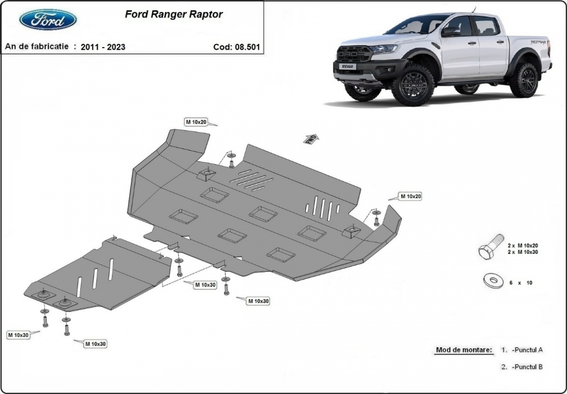 Skid plate for the protection of the: engine, front bumper The skid plate is new and fits perfectly for all versions of Ford Ranger Raptor manufactured between 2020 and 2023. Made out of 3 mm thick Steel plate. Screws, nuts, clips, all fastening accessories are included. All skid plates are powder coated to prevent corrosion. The exterior of the skid plate is provided with Steel reinforcements, which increases the resistance to impact. |