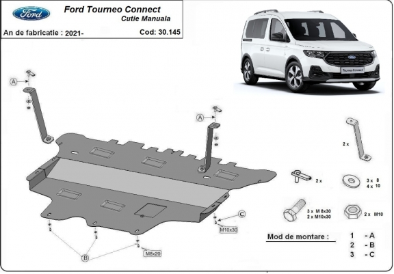 Skid plate for the protection of the: engine, gearbox, radiator, front bumper The skid plate is new and fits perfectly for all versions of Ford Tourneo Connect manufactured between 2021 and 2026. Made out of 2 mm thick Steel plate. Screws, nuts, clips, all fastening accessories are included. All skid plates are powder coated to prevent corrosion. The exterior of the skid plate is provided with Steel reinforcements, which increases the resistance to impact. |