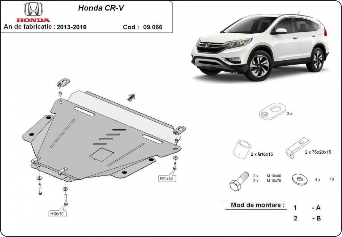 Skid plate for the protection of the: engine, gearbox, radiator The skid plate is new and fits perfectly for all versions of Honda CR-V manufactured between 2013 and 2016. It has an opening for the oil sump, so it's removal won't be necessary to change the oil. Made out of 2,5 mm thick Steel plate. Screws, nuts, clips, all fastening accessories are included. All skid plates are powder coated to prevent corrosion. The exterior of the skid plate is provided with Steel reinforcements, which increases the resistance to impact. |