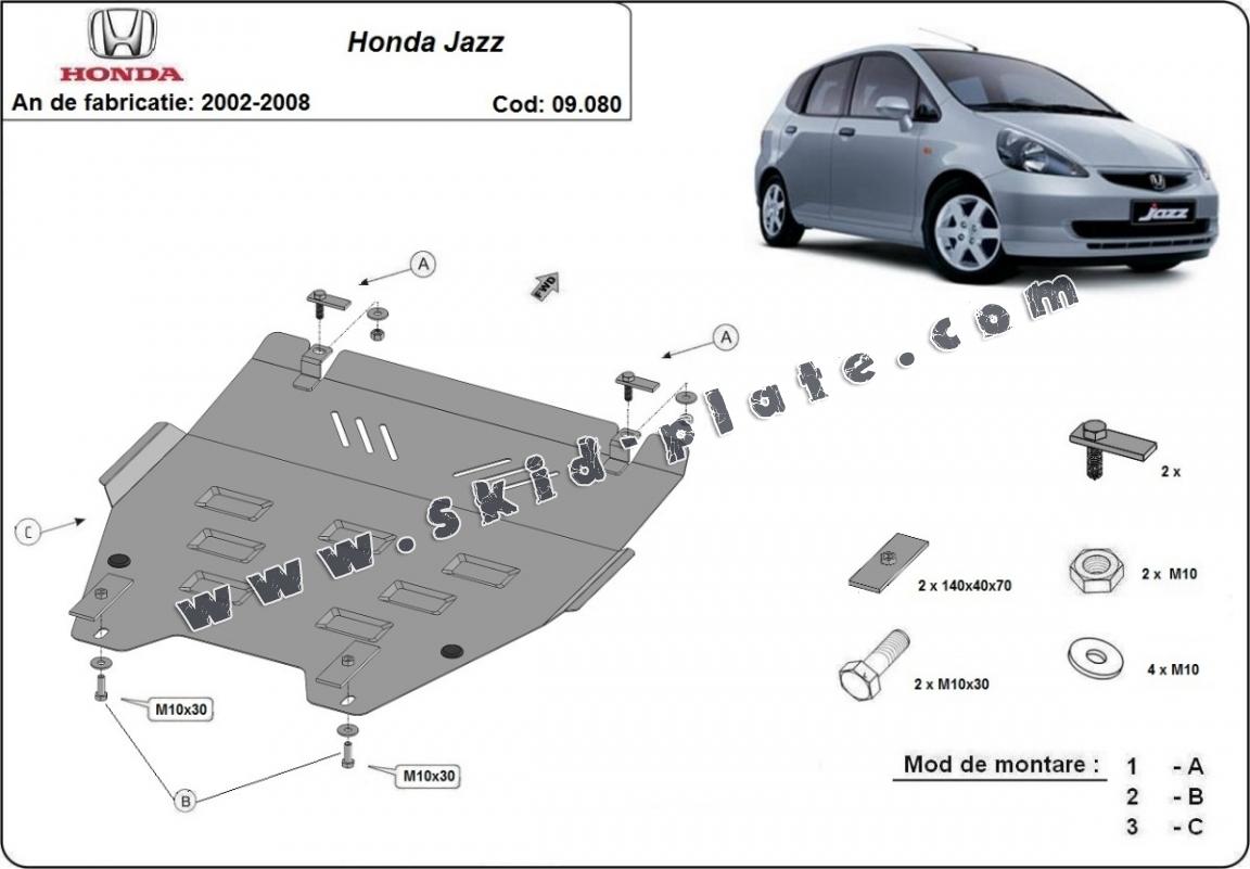 Skid plate for the protection of the: engine, radiator, front bumper The skid plate is new and fits perfectly for all versions of Honda Jazz manufactured between 2002 and 2008. Made out of 2 mm thick Steel plate. Screws, nuts, clips, all fastening accessories are included. All skid plates are powder coated to prevent corrosion. The exterior of the skid plate is provided with Steel reinforcements, which increases the resistance to impact. |