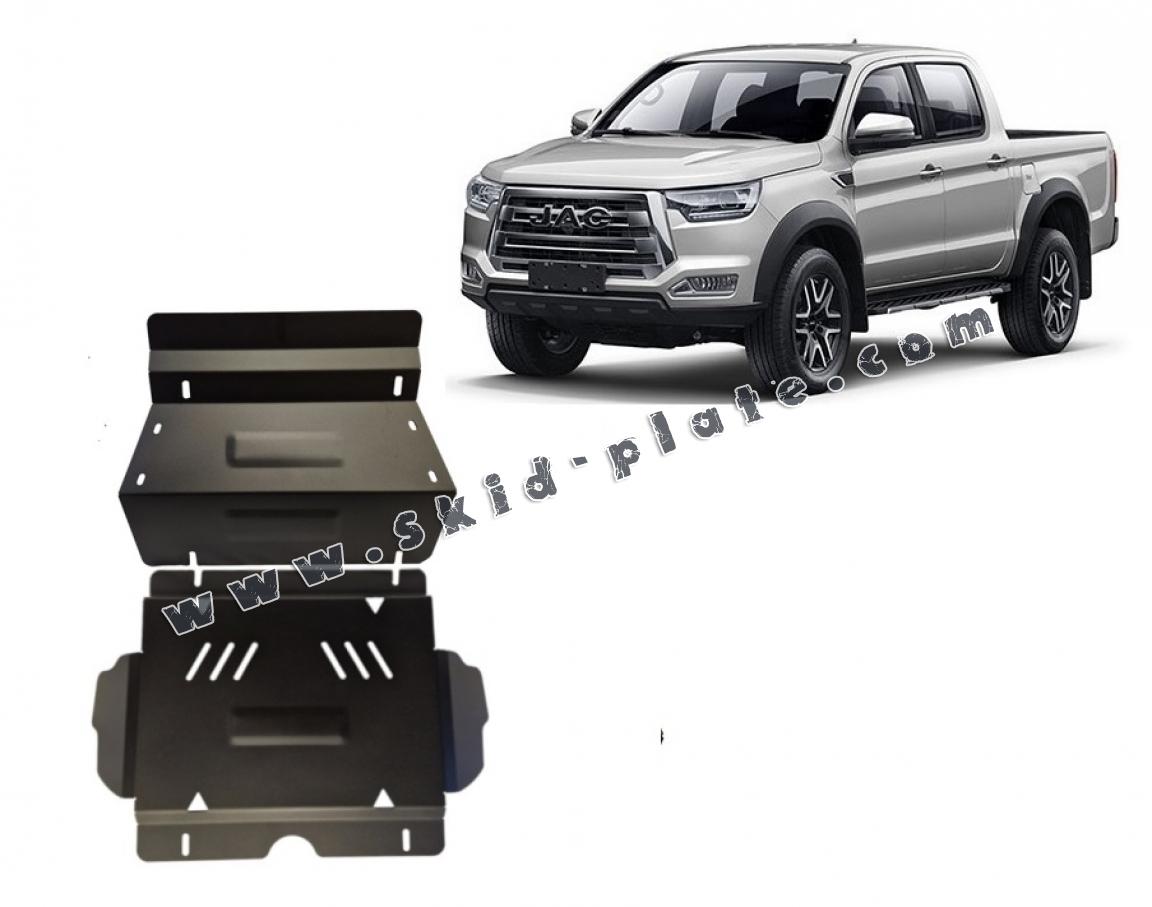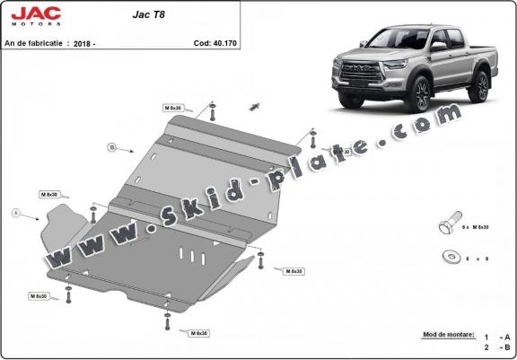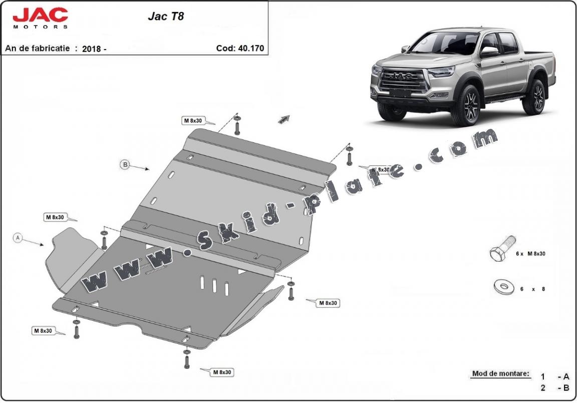 Skid plate for the protection of the: engine, radiator The skid plate is new and fits perfectly for all versions of Jac T8 manufactured between 2018 and 2026. Made out of 2.5 mm thick Steel plate. Screws, nuts, clips, all fastening accessories are included. All skid plates are powder coated to prevent corrosion. The exterior of the skid plate is provided with Steel reinforcements, which increases the resistance to impact. |