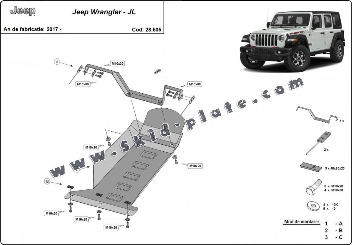 Skid plate for the protection of the: engine The skid plate is new and fits perfectly for all versions of Jeep Wrangler manufactured between 2017 and 2026. Made out of 2 mm thick Steel plate. Screws, nuts, clips, all fastening accessories are included. All skid plates are powder coated to prevent corrosion. The exterior of the skid plate is provided with Steel reinforcements, which increases the resistance to impact. |