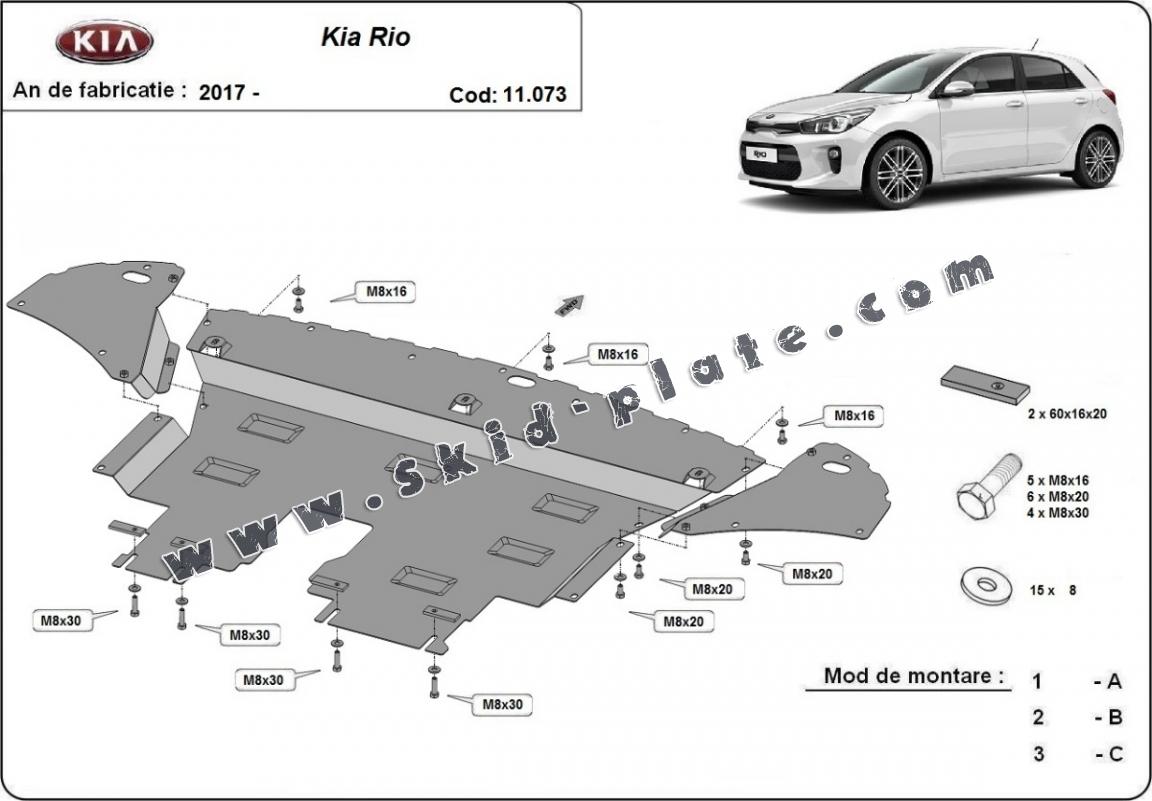 Skid plate for the protection of the: engine, gearbox, radiator, front bumper The skid plate is new and fits perfectly for all versions of Kia Rio 4 manufactured between 2017 and 2026. Made out of 2 mm thick Steel plate. Screws, nuts, clips, all fastening accessories are included. All skid plates are powder coated to prevent corrosion. The exterior of the skid plate is provided with Steel reinforcements, which increases the resistance to impact. |