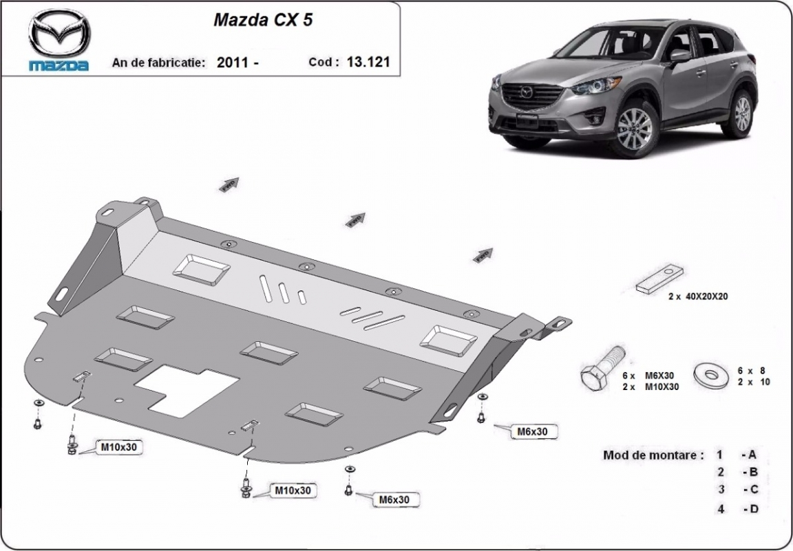 Skid plate for the protection of the: engine, gearbox, radiator The skid plate is new and fits perfectly for all versions of Mazda CX5 manufactured between 2011 and 2026. Made out of 2 mm thick Steel plate. Screws, nuts, clips, all fastening accessories are included. All skid plates are powder coated to prevent corrosion. The exterior of the skid plate is provided with Steel reinforcements, which increases the resistance to impact. |