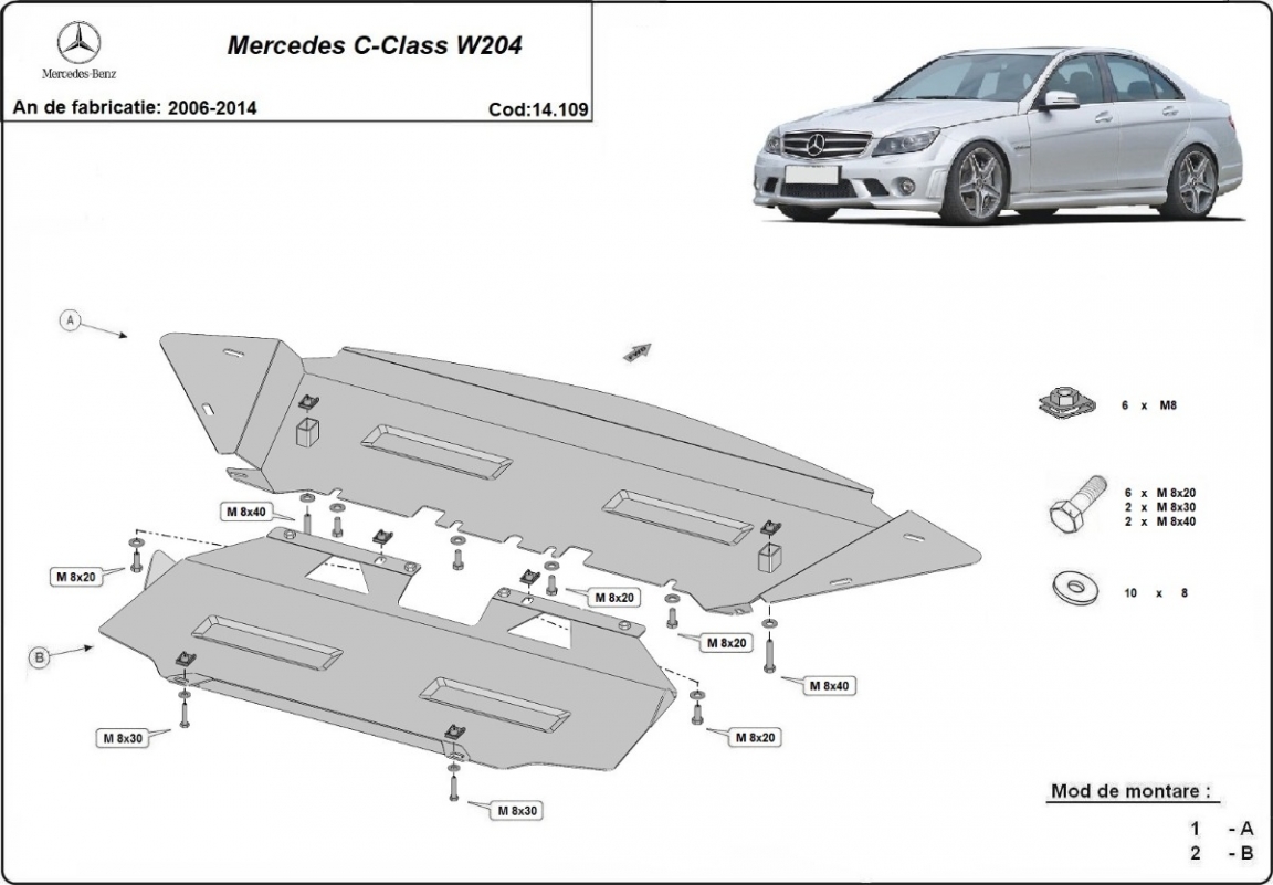 Skid plate for the protection of the: engine, radiator, front bumper The skid plate is new and fits perfectly for all versions of Mercedes C-Class W204 manufactured between 2006 and 2014. Made out of 2 mm thick Steel plate. Screws, nuts, clips, all fastening accessories are included. All skid plates are powder coated to prevent corrosion. The exterior of the skid plate is provided with Steel reinforcements, which increases the resistance to impact. |