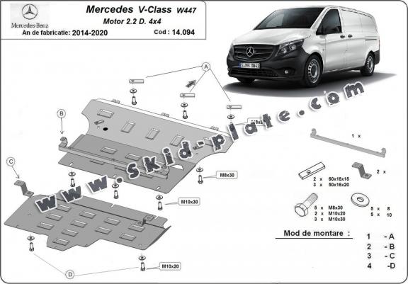 The skid plate is new and fits perfectly for the Mercedes V-Class W447 2.2 D, 4x4, with the following engine/drive versions: 2.2 D, 3.0 4x4 - manufactured between 2014 and 2020.