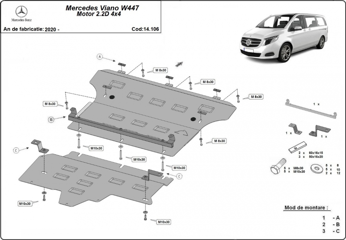 Skid plate for the protection of the: engine, gearbox, radiator, EGR, system STOP&GO The skid plate is new and fits perfectly for the Mercedes Viano W447, with the following engine/drive versions: 2.0, 2.2 - manufactured between 2020 and 2026. Made out of 2.5 mm thick Steel plate. Screws, nuts, clips, all fastening accessories are included. All skid plates are powder coated to prevent corrosion. The exterior of the skid plate is provided with Steel reinforcements, which increases the resistance to impact. |