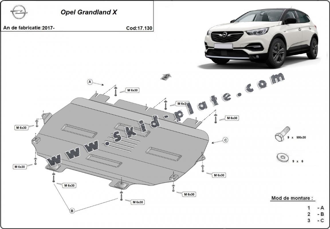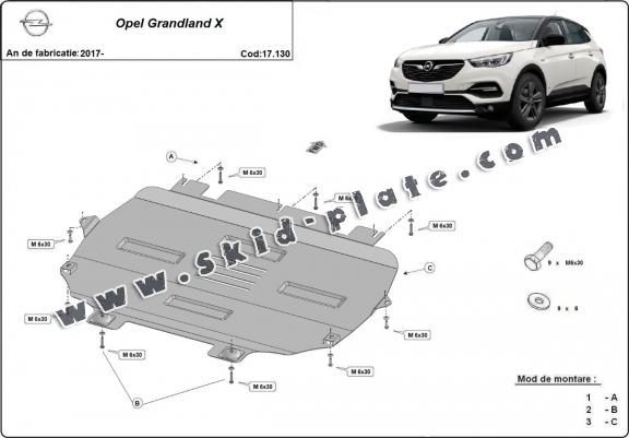 Skid plate for the protection of the: engine, gearbox, radiator The skid plate is new and fits perfectly for all versions of Opel Grandland X manufactured between 2017 and 2026. Made out of 2 mm thick Steel plate. Screws, nuts, clips, all fastening accessories are included. All skid plates are powder coated to prevent corrosion. The exterior of the skid plate is provided with Steel reinforcements, which increases the resistance to impact. |