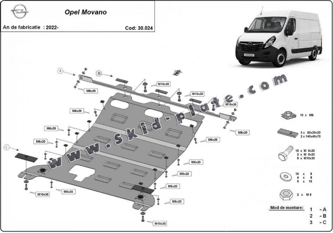 Skid plate for the protection of the: engine, gearbox, radiator The skid plate is new and fits perfectly for all versions of Opel Movano manufactured between 2022 and 2026. Made out of 2.5 mm thick Steel plate. Screws, nuts, clips, all fastening accessories are included. All skid plates are powder coated to prevent corrosion. The exterior of the skid plate is provided with Steel reinforcements, which increases the resistance to impact. |