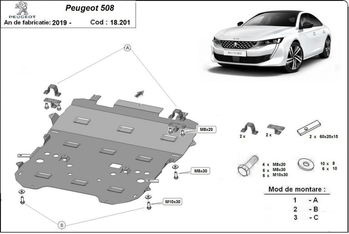 Skid plate for the protection of the: engine, gearbox, radiator, front bumper The skid plate is new and fits perfectly for all versions of Peugeot 508 manufactured between 2019 and 2026. Made out of 2 mm thick Steel plate. Screws, nuts, clips, all fastening accessories are included. All skid plates are powder coated to prevent corrosion. The exterior of the skid plate is provided with Steel reinforcements, which increases the resistance to impact. |