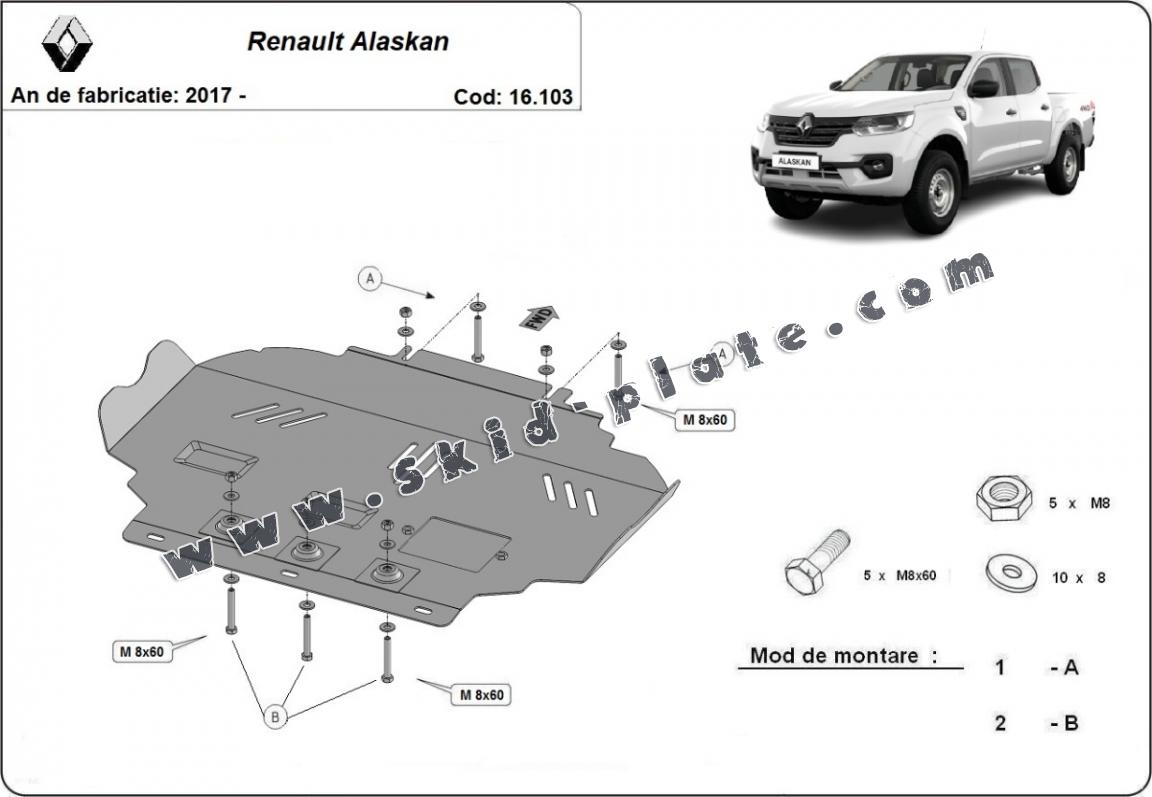 Skid plate for the protection of the: engine The skid plate is new and fits perfectly for all versions of Renault Alaskan manufactured between 2017 and 2026. Made out of 2.5 mm thick Steel plate. Screws, nuts, clips, all fastening accessories are included. All skid plates are powder coated to prevent corrosion. The exterior of the skid plate is provided with Steel reinforcements, which increases the resistance to impact. |