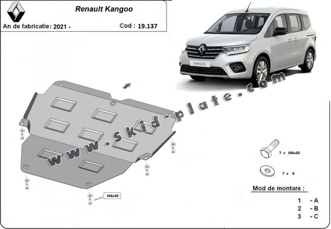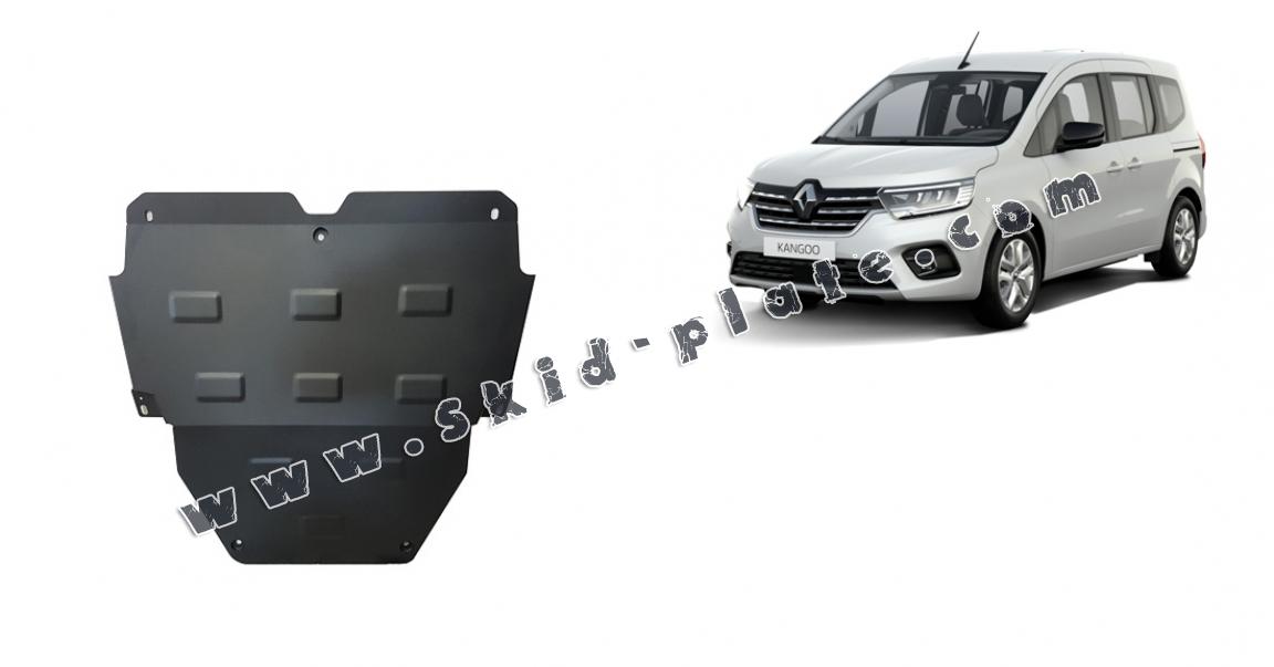 Skid plate for the protection of the: engine, gearbox The skid plate is new and fits perfectly for all versions of Renault Kangoo manufactured between 2021 and 2026. Made out of 2 mm thick Steel plate. Screws, nuts, clips, all fastening accessories are included. All skid plates are powder coated to prevent corrosion. The exterior of the skid plate is provided with Steel reinforcements, which increases the resistance to impact. |