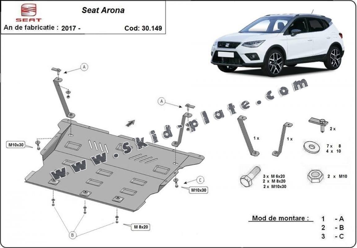 Skid plate for the protection of the: engine, gearbox, radiator, front bumper, particle filter The skid plate is new and fits perfectly for all versions of Seat Arona manufactured between 2017 and 2026. Made out of 2 mm thick Steel plate. Screws, nuts, clips, all fastening accessories are included. All skid plates are powder coated to prevent corrosion. The exterior of the skid plate is provided with Steel reinforcements, which increases the resistance to impact. |