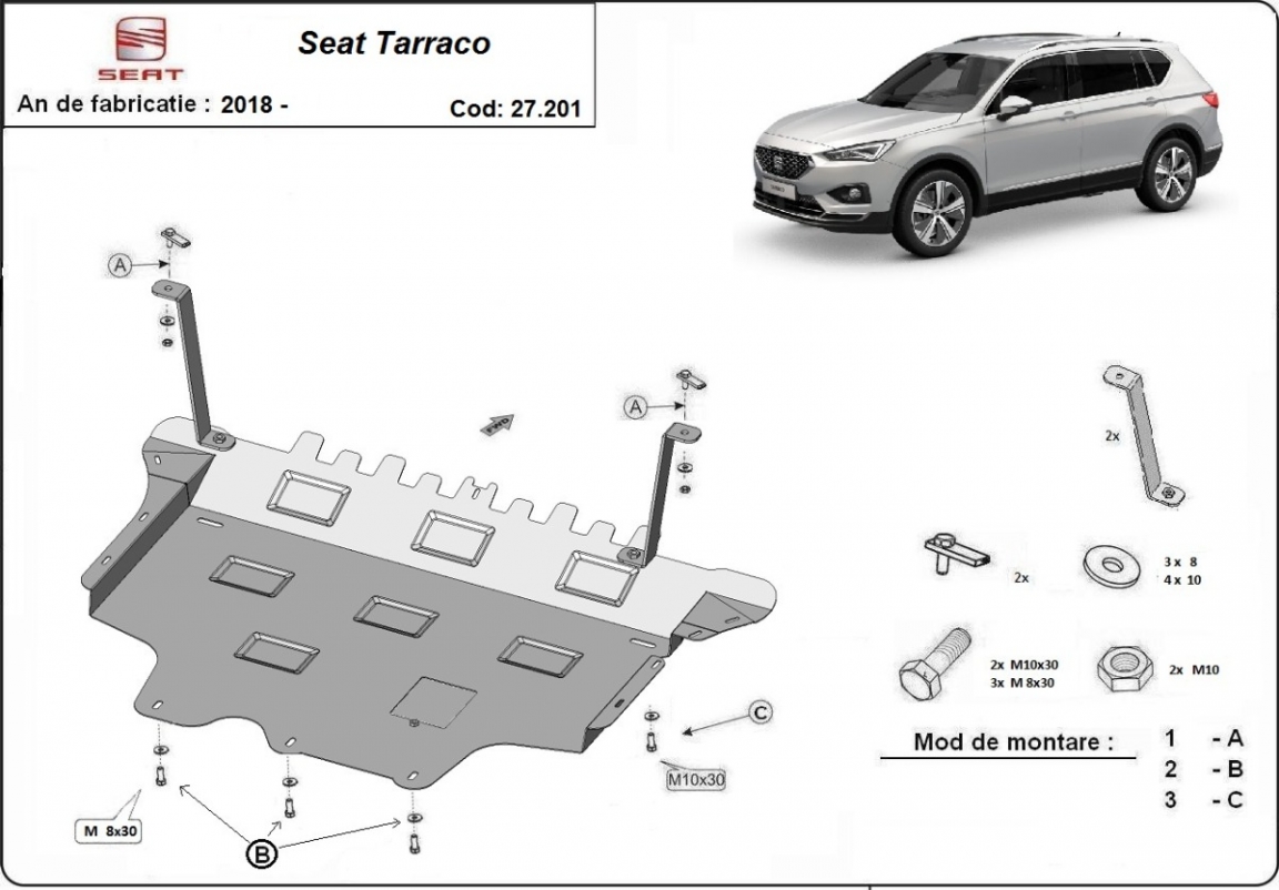 Skid plate for the protection of the: engine, gearbox, radiator The skid plate is new and fits perfectly for all versions of Seat Tarraco manufactured between 2018 and 2024. It has an opening for the oil sump, so it's removal won't be necessary to change the oil. Made out of 2 mm thick Steel plate. Screws, nuts, clips, all fastening accessories are included. All skid plates are powder coated to prevent corrosion. The exterior of the skid plate is provided with Steel reinforcements, which increases the resistance to impact. |