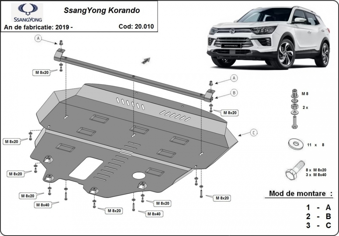 The skid plate is new and fits perfectly for all versions of SsangYong Korando manufactured between 2019 and 2026.
