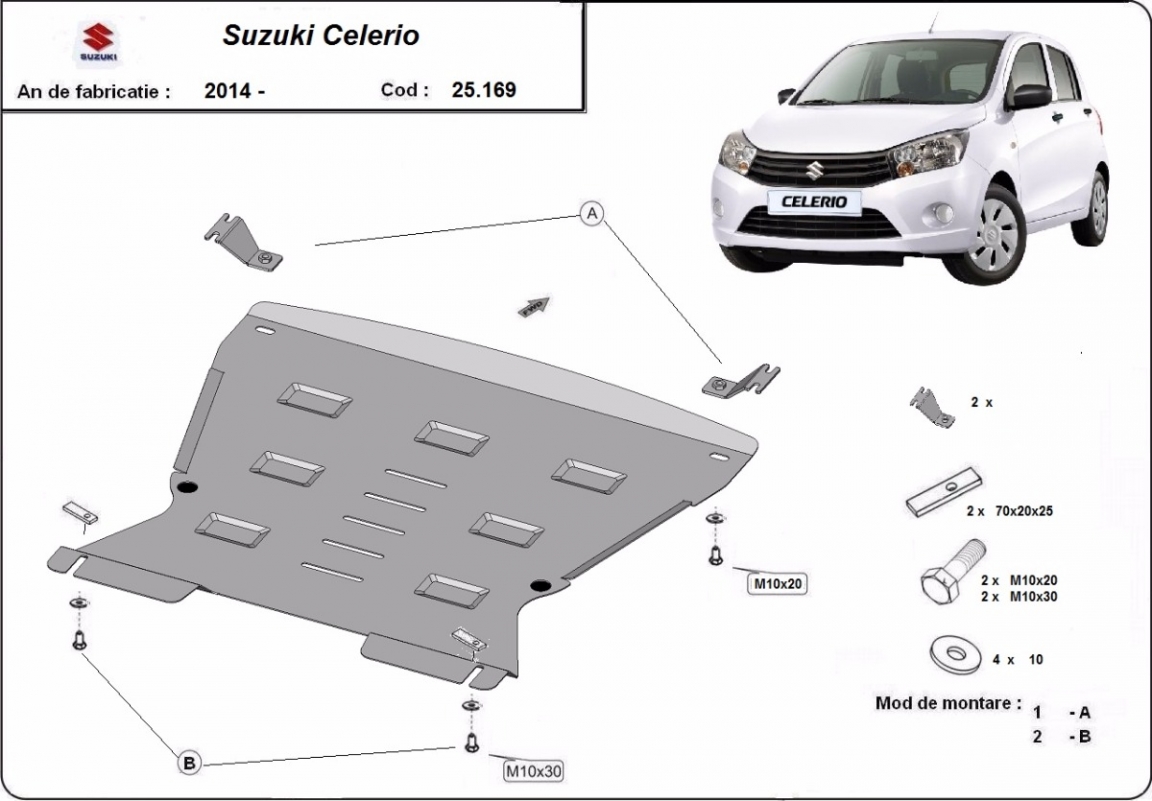 Skid plate for the protection of the: engine, gearbox, radiator, front bumper The skid plate is new and fits perfectly for all versions of Suzuki Celerio manufactured between 2014 and 2026. Made out of 2 mm thick Steel plate. Screws, nuts, clips, all fastening accessories are included. All skid plates are powder coated to prevent corrosion. The exterior of the skid plate is provided with Steel reinforcements, which increases the resistance to impact. |