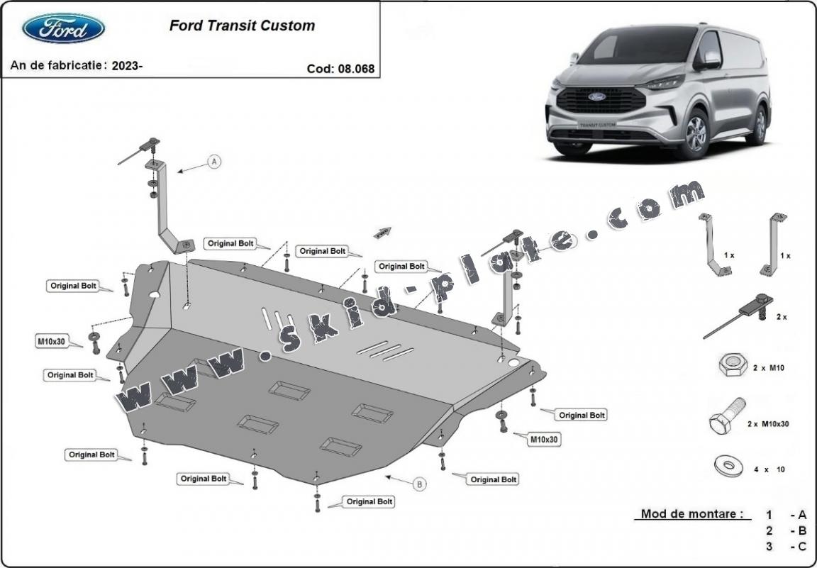Skid plate for the protection of the: engine, gearbox, radiator The skid plate is new and fits perfectly for all versions of Ford Transit Custom manufactured between 2023 and 2026. Made out of 2 mm thick Steel plate. Screws, nuts, clips, all fastening accessories are included. All skid plates are powder coated to prevent corrosion. The exterior of the skid plate is provided with Steel reinforcements, which increases the resistance to impact. |