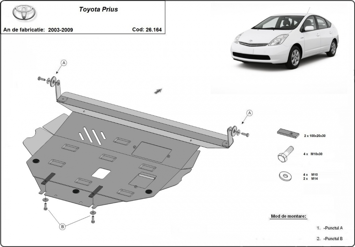 Skid plate for the protection of the: engine, gearbox, radiator The skid plate is new and fits perfectly for all versions of Toyota Prius manufactured between 2003 and 2009. Made out of 2 mm thick Steel plate. Screws, nuts, clips, all fastening accessories are included. All skid plates are powder coated to prevent corrosion. The exterior of the skid plate is provided with Steel reinforcements, which increases the resistance to impact. |
