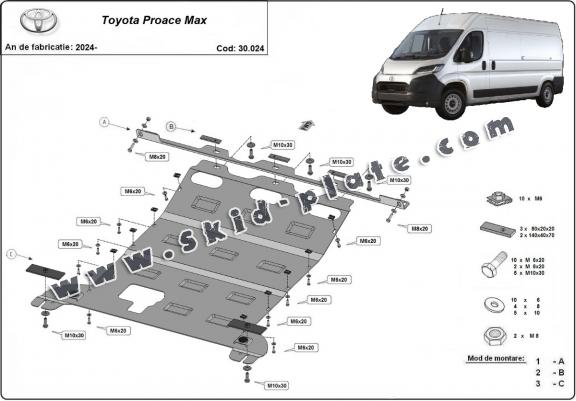 Skid plate for the protection of the: engine, gearbox, radiator The skid plate is new and fits perfectly for all versions of Toyota Proace Max manufactured between 2024 and 2026. Made out of 2.5 mm thick Steel plate. Screws, nuts, clips, all fastening accessories are included. All skid plates are powder coated to prevent corrosion. The exterior of the skid plate is provided with Steel reinforcements, which increases the resistance to impact. |