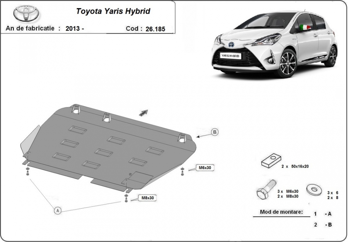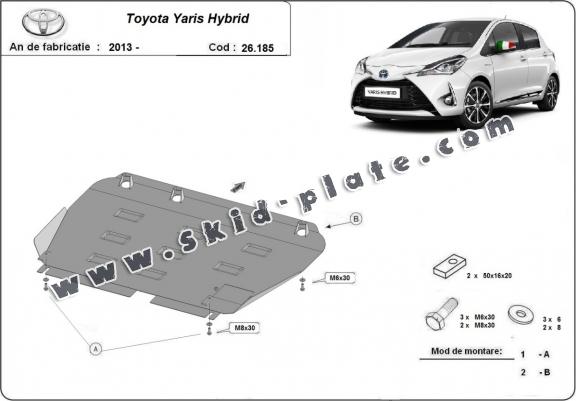 Skid plate for the protection of the: engine, gearbox, radiator The skid plate is new and fits perfectly for the Toyota Yaris Hybrid, with the following engine/drive versions: XP150, all, Hybrid - manufactured between 2013 and 2021. Made out of 2 mm thick Steel plate. Screws, nuts, clips, all fastening accessories are included. All skid plates are powder coated to prevent corrosion. The exterior of the skid plate is provided with Steel reinforcements, which increases the resistance to impact. |