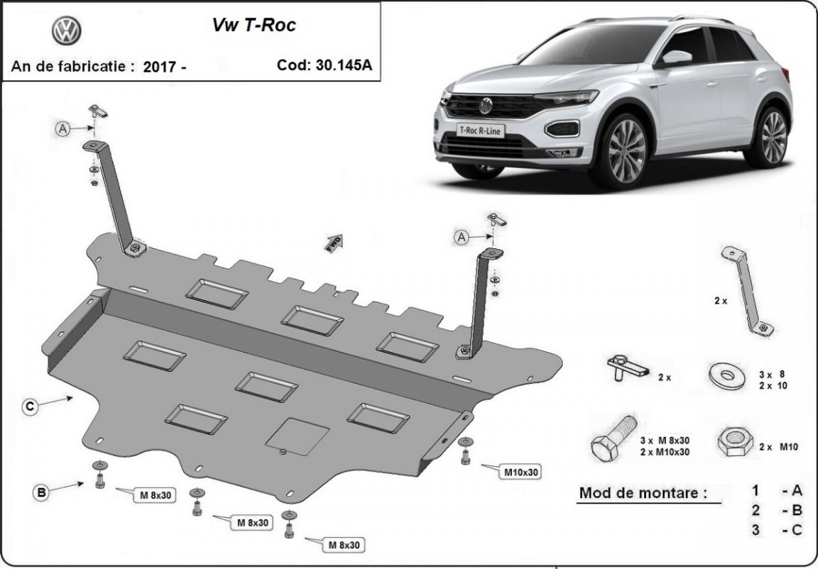 Skid plate for the protection of the: engine, gearbox, radiator, front bumper The skid plate is new and fits perfectly for all versions of Volkswagen T-Roc manufactured between 2017 and 2026. Made out of 2 mm thick Steel plate. Screws, nuts, clips, all fastening accessories are included. All skid plates are powder coated to prevent corrosion. The exterior of the skid plate is provided with Steel reinforcements, which increases the resistance to impact. |