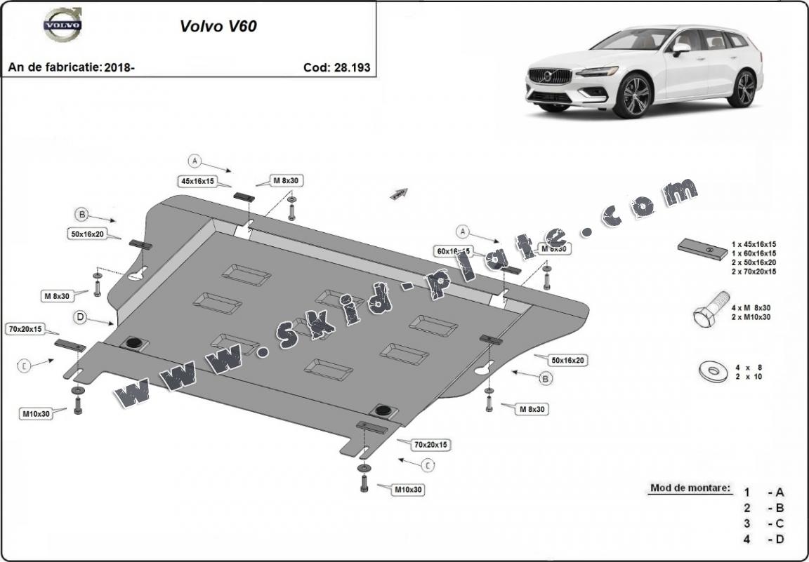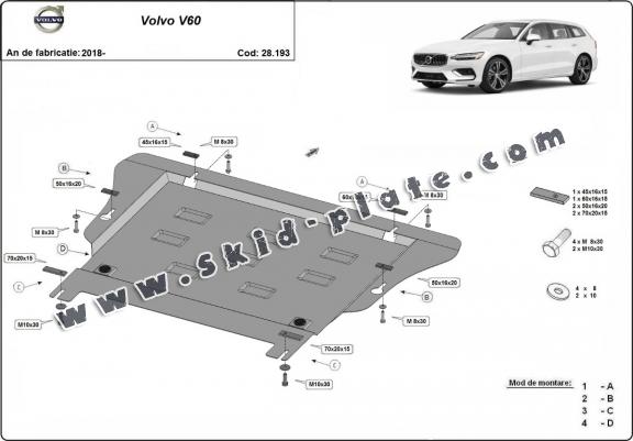 Skid plate for the protection of the: engine, gearbox The skid plate is new and fits perfectly for all versions of Volvo V60 manufactured between 2018 and 2025. Made out of 2 mm thick Steel plate. Screws, nuts, clips, all fastening accessories are included. All skid plates are powder coated to prevent corrosion. The exterior of the skid plate is provided with Steel reinforcements, which increases the resistance to impact. |