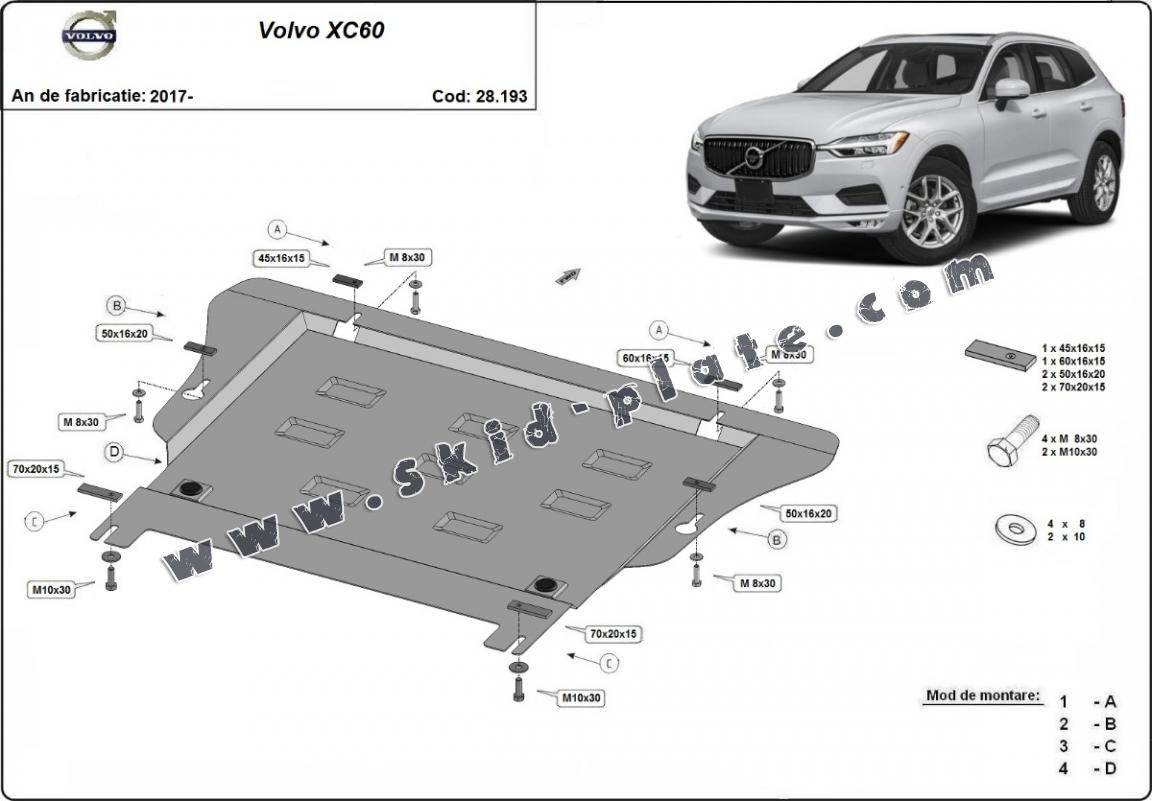 Skid plate for the protection of the: engine, gearbox The skid plate is new and fits perfectly for all versions of Volvo XC60 manufactured between 2017 and 2026. Made out of 2 mm thick Steel plate. Screws, nuts, clips, all fastening accessories are included. All skid plates are powder coated to prevent corrosion. The exterior of the skid plate is provided with Steel reinforcements, which increases the resistance to impact. |