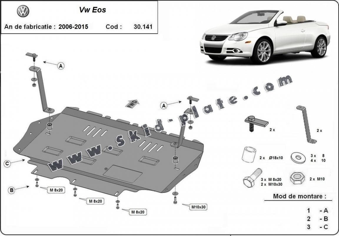 Skid plate for the protection of the: engine, gearbox, radiator The skid plate is new and fits perfectly for the VW Eos, with the following engine/drive versions: 1.6FSI, 2.0TDI - manufactured between 2006 and 2015. Made out of 2 mm thick Steel plate. Screws, nuts, clips, all fastening accessories are included. All skid plates are powder coated to prevent corrosion. The exterior of the skid plate is provided with Steel reinforcements, which increases the resistance to impact. |