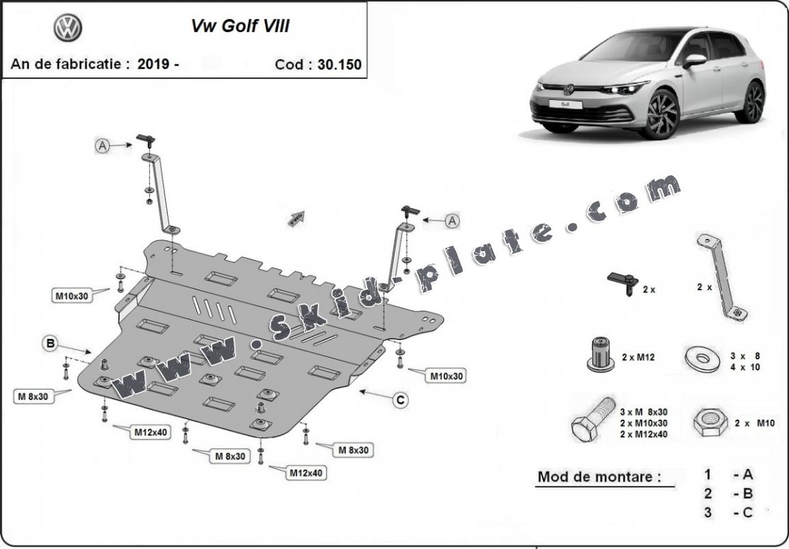 Skid plate for the protection of the: engine, gearbox, radiator The skid plate is new and fits perfectly for all versions of VW Golf 8 manufactured between 2019 and 2026. Made out of 2 mm thick Steel plate. Screws, nuts, clips, all fastening accessories are included. All skid plates are powder coated to prevent corrosion. The exterior of the skid plate is provided with Steel reinforcements, which increases the resistance to impact. |