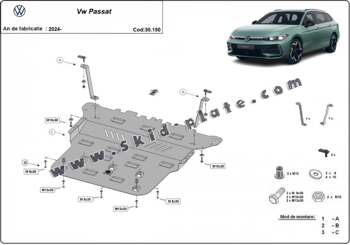 Skid plate for the protection of the: engine, gearbox, radiator, electric power steering gear The skid plate is new and fits perfectly for all versions of VW Passat manufactured between 2024 and 2026. Made out of 2 mm thick Steel plate. Screws, nuts, clips, all fastening accessories are included. All skid plates are powder coated to prevent corrosion. The exterior of the skid plate is provided with Steel reinforcements, which increases the resistance to impact. |