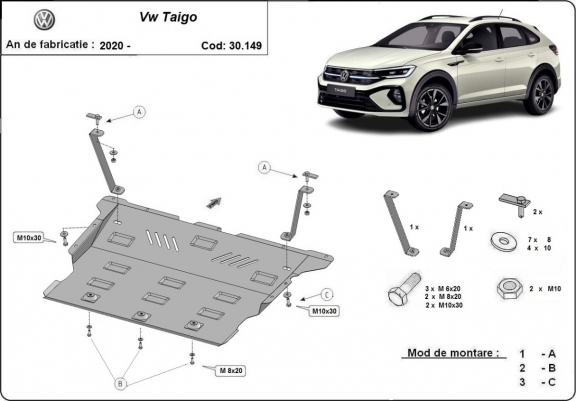 Skid plate for the protection of the: engine, gearbox, radiator, front bumper The skid plate is new and fits perfectly for all versions of VW Taigo manufactured between 2020 and 2026. Made out of 2 mm thick Steel plate. Screws, nuts, clips, all fastening accessories are included. All skid plates are powder coated to prevent corrosion. The exterior of the skid plate is provided with Steel reinforcements, which increases the resistance to impact. |