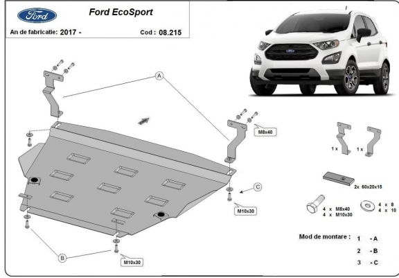 Skid plate for the protection of the: engine, gearbox, radiator The skid plate is new and fits perfectly for all versions of Ford EcoSport manufactured between 2017 and 2026. Made out of 2 mm thick Steel plate. Screws, nuts, clips, all fastening accessories are included. All skid plates are powder coated to prevent corrosion. The exterior of the skid plate is provided with Steel reinforcements, which increases the resistance to impact. |